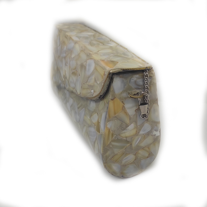 clutch nacar artesano, está hecho a mano. Tiene una cadena para poder colgarlo.